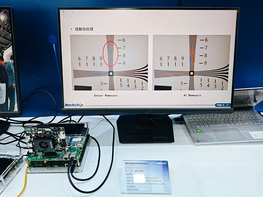 作为本次的重磅新品,瑞芯微新一代4K机器视觉芯片RV1126B备受关注。RV1126B具备3T强劲算力,可运行2B以内规模的大语言模型及多模态模型,针对算力、AI-ISP、AOV3.0、超级编码、防抖等性能均有明显升级。现场演示了多项引领行业的技术应用,赋能各类视觉设备实现从“看得见”到“看得懂”的质的飞跃: